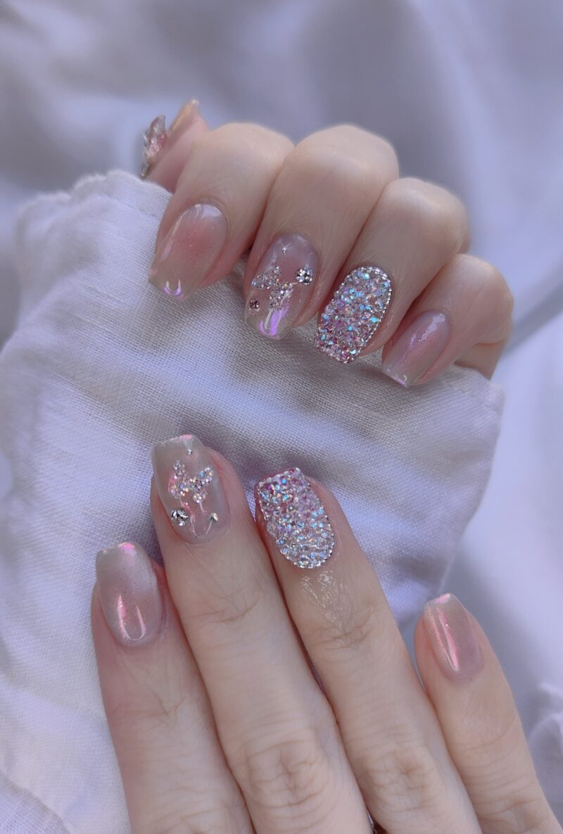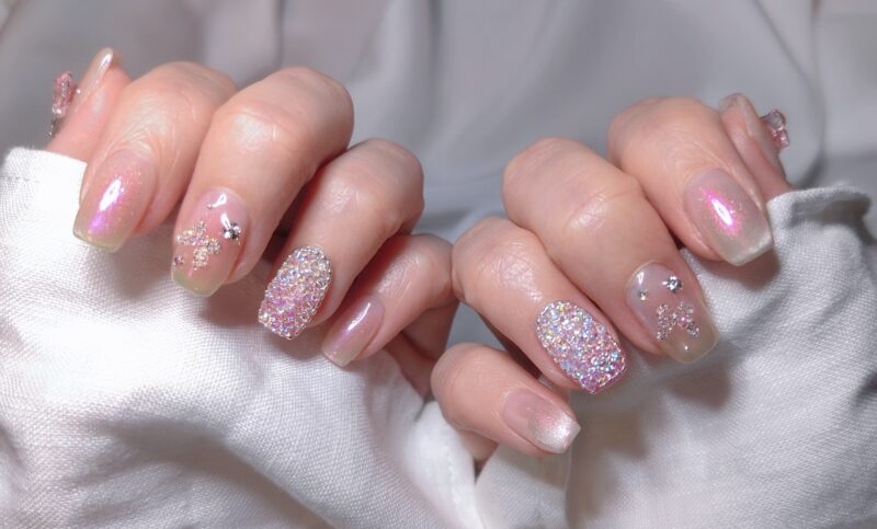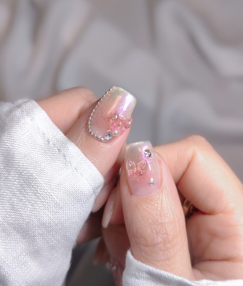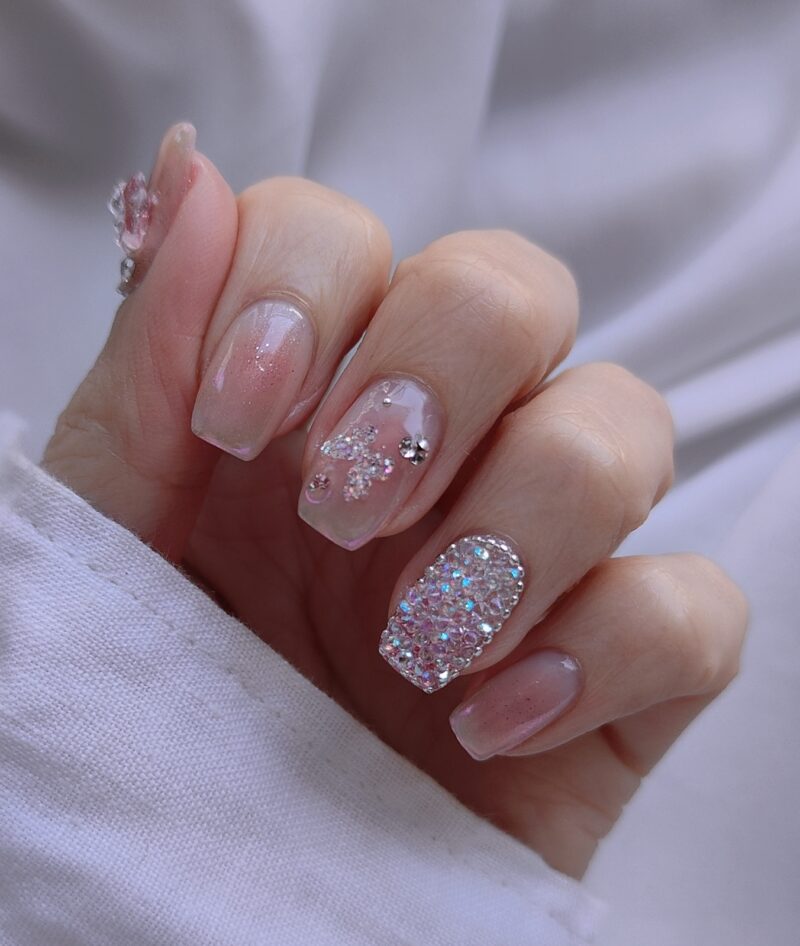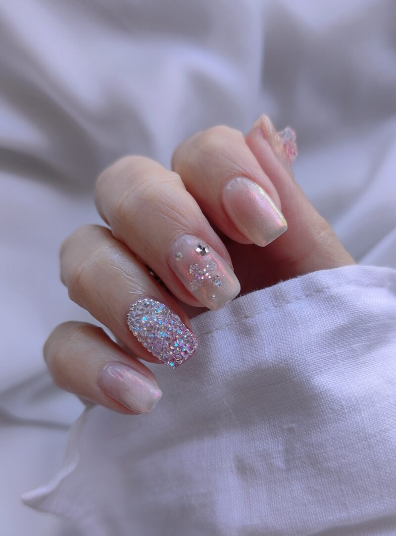 春になるとピクシーをやりたくなる💎ボニービーネイルのピクシーはたぶんスワロフスキーのピクシーなのでお高いですが、安いのとは輝きが全然違います✨上側をコーティングするなら安いピクシーでもいいかなとも思う😉